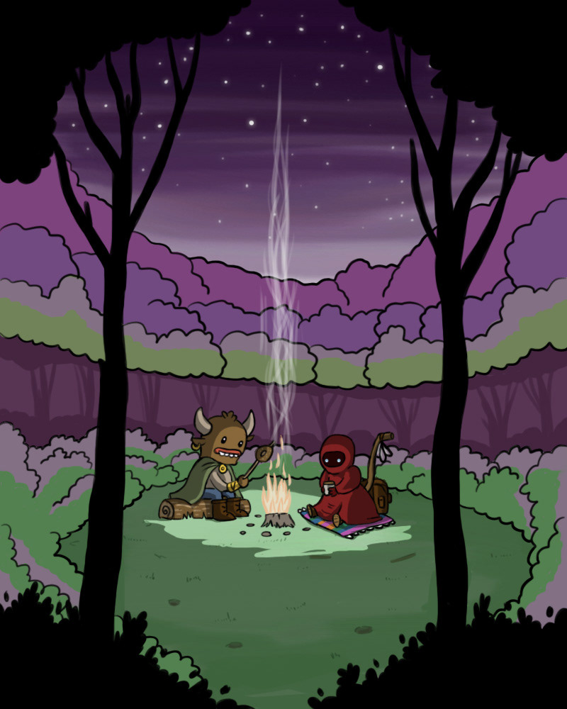 After a long day of adventuring the Adventurers settle in for the night, light a fire, cook their favourite meals, and plan ahead for the next day